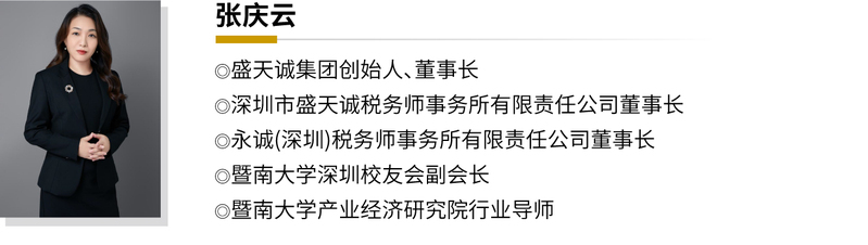 张庆云女士于 2007年创办深圳市盛天诚税务师事务所有限责任公司,为广东省盛天诚实业集团有限公司创始人,拥有多年税务系统相关工作经验和珠三角地区高端咨询顾问服务、大型财税项目管理经验,历任麦肯锡(大中华)、TCL集团等多家知名上市企业财税顾问。十多年来始终践行着诚信、专业、高效、奉献、创新的企业价值观,秉持成就员工、成就客户、风险价值、回馈社会的经营理念,为客户提供专业化定制化服务,带领企业开拓创新并取得一系列成绩及荣誉。2021年带领公司跻身中国注册税务师协会发布税务师行业经营收入的全国百强名单。同年,与香港税务师联合创办全国首批两家跨境执业税务师事务所。2022年,盛天诚税务师事务所被评为年度TSC5级涉税专业服务机构。2023年,荣获深圳湾校友企业家峰会诚信校友企业。作为企业家,经营企业的同时仍积极参与社会公益活动,慰问敬老院.为乡村教师公益培训筹集爱心款项等。对于企业未来的发展,无论是个人或企业,将聚力与国际接轨。个人目前正通过优才通道申请香港永居身份,现已取得香港临时身份,在跨境出海为热点趋势的环境下,积极开拓海外市场,搭建海外业务链接平台,同时将带领盛天诚集团,以“稳健发展、平台转型、合作共赢”为战略核心,推动信息化、数字化转型,构建财务、税务、金融、法律一体化信息共享平台,充分整合和集聚税务、会计和法律专业化服务资源,发挥与港澳业务的联动优势。