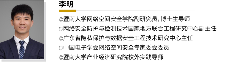 李明,硕士/博士生导师,中组部青年拔尖人才,网络安全防护与检测技术国家地方联合工程研究中心副主任。曾任职华为公司,先后在加拿大、新加坡留学访问,从事区块链、隐私计算等研究。近年来在IEEE TDSC、IEEE TPDS等期刊发表30余篇论文。获2021年度广东省自然科学一等奖,连续两年获广东省计算机学会优秀论文一等奖(2019年度、2020年度)。担任中国电子学会网络空间安全专家委会委员、中国人工智能学会智能服务专业委员会委员、中国密码学会区块链专委会委员、ACM SIGSAC China委员、广东数据资产登记合规委员会委员、广东省“数字政府”特聘专家、广东省区块链产业联盟专家委员会委员。担任教育部、国家基金委等项目评审专家,受邀担任多个国际会议的程序委员会委员,如IEEE ICC 2023、IEEE MSN 2023等。近年来主持参与国家级青年人才项目、国家自然科学基金青年基金、国家自然基金重点项目、广东省卓越青年团队项目、广州市基础与应用基础研究项目等项目。授权国内外发明专利37项(美国专利4项),入选“全球区块链专利创新人才百榜”,参与国家行业地方标准7项。带领团队研发的系统获中国国际“互联网+”大学生创新创业大赛全国总决赛金奖、全国高校区块链大赛一等奖、全国大学生信息安全竞赛一等奖等奖项。