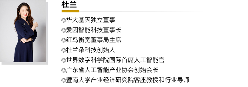 杜兰:系统工程博士,管理学博士后,教授级高级经济师,博士生导师。现任华大基因独立董事、爱因智能科技董事长、红鸟衡宽董事局主席、杜兰朵科技创始人,曾任科大讯飞股份有限公司高级副总裁、科大讯飞华南公司总裁、科大讯飞华南研究院董事长、易听说董事长等职。