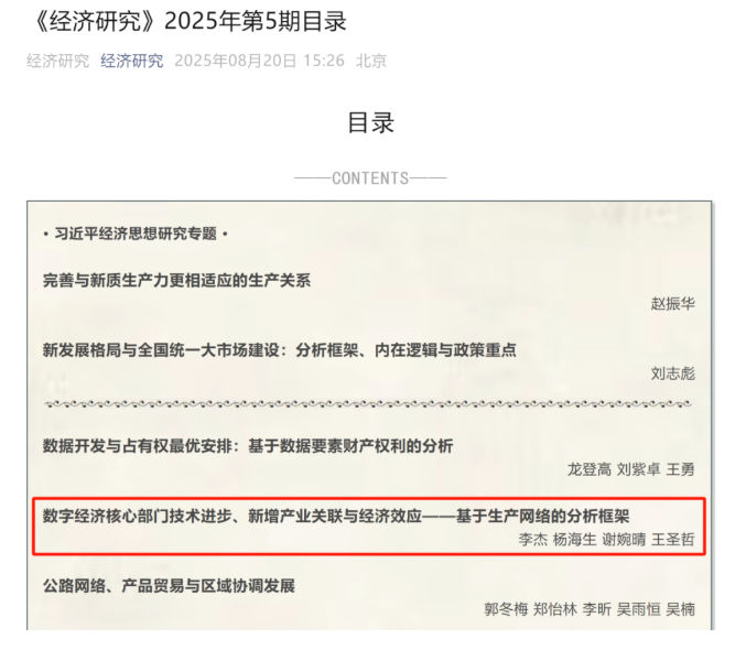 喜讯 | 我院研究员李杰带领博士研究生谢婉晴、王圣哲在中国经济学领域顶尖核心期刊《经济研究》发表论文