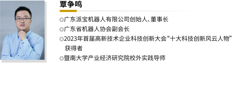 覃争鸣毕业于华南理工大学计算机科学与技术专业,硕士研究生学历,曾带领华南理工大学计算机学院机器人团队多次获得国际机器人比赛冠/亚军,擅长运动规划算法。深耕机器人应用领域12年,拥有丰富的技术研发及团队管理经验。秉承着对机器人行业的情怀,2013年创办了派宝机器人,致力于商业服务机器人的研发、制造,解决智慧楼宇、智慧园区的无人化服务产品方案的落地应用。